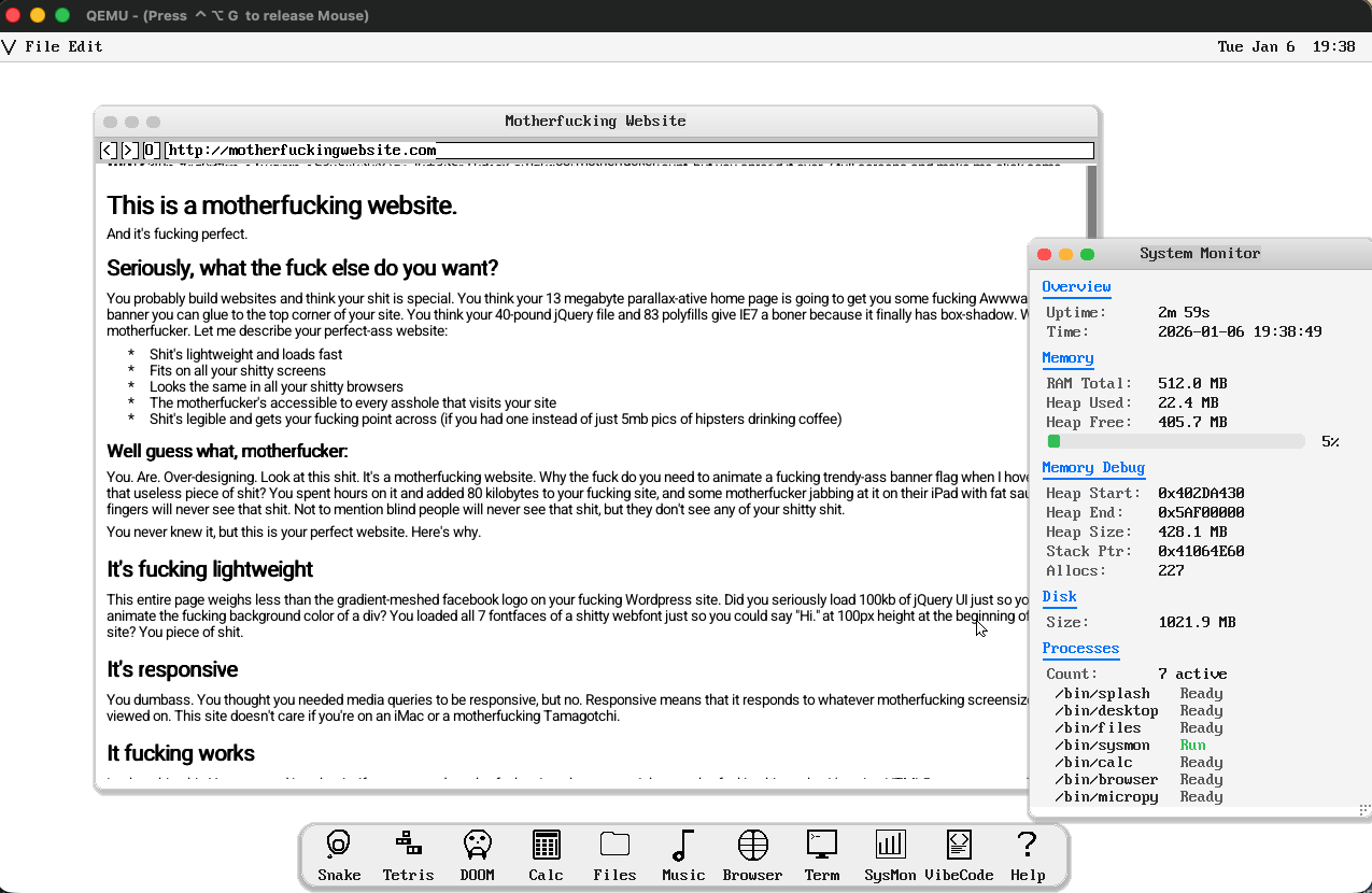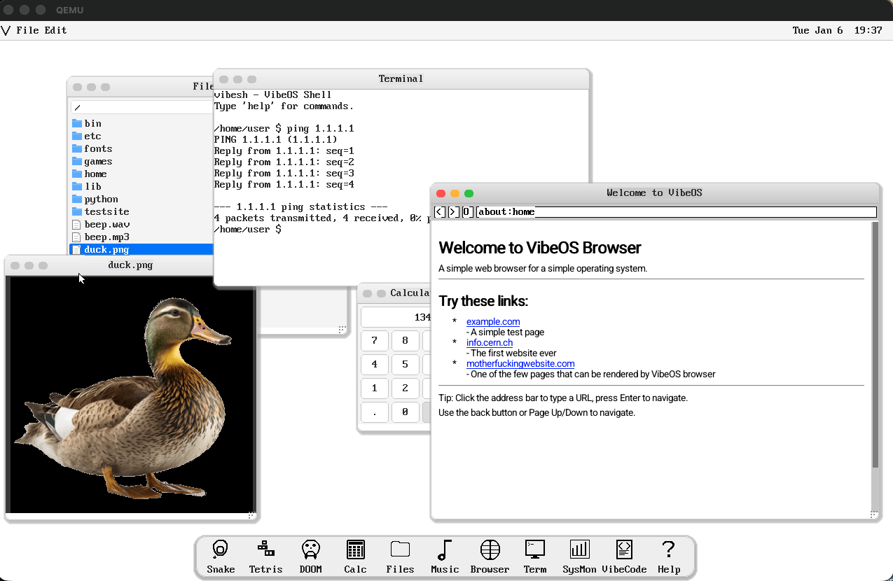 I built an operating system with Claude that boots on real hardware, browses the web, runs DOOM, and has a C compiler and Python. VibeOS runs in Qemu aarch64, and Raspberry Pi Zero 2W.